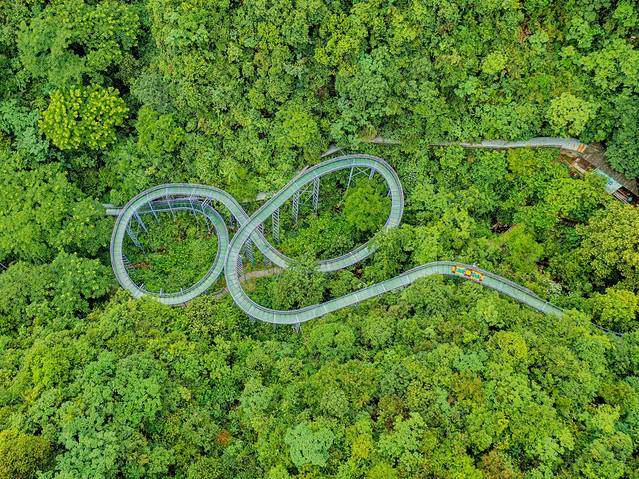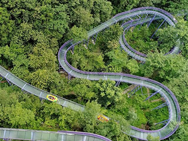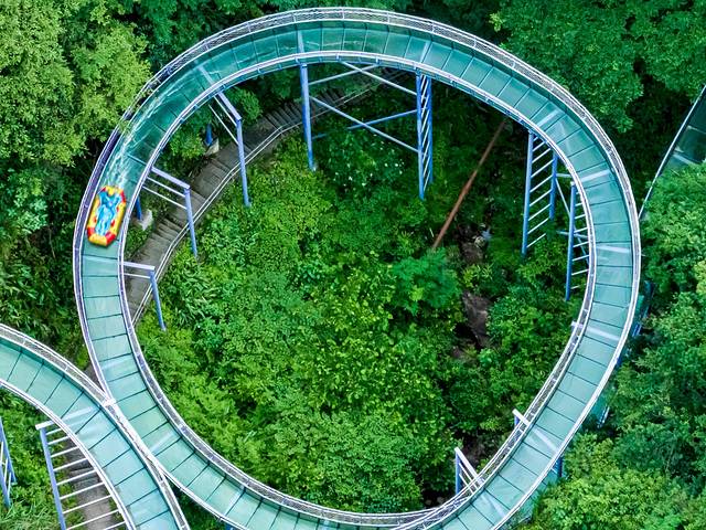 夏日避暑最少不了的当然是漂流!天子地的紫龙峡玻璃漂流全长3.8公里、落差400米,相当于70楼层高漂流下来,全程漂流约10分钟。在2021年1月份获得世界WRCA纪录,是世界最长的一条带状高空玻璃漂流!从“上帝的视角”来看,依山而建的滑道像一条紫色水晶巨龙蜿蜒盘旋在崇山峻岭间。