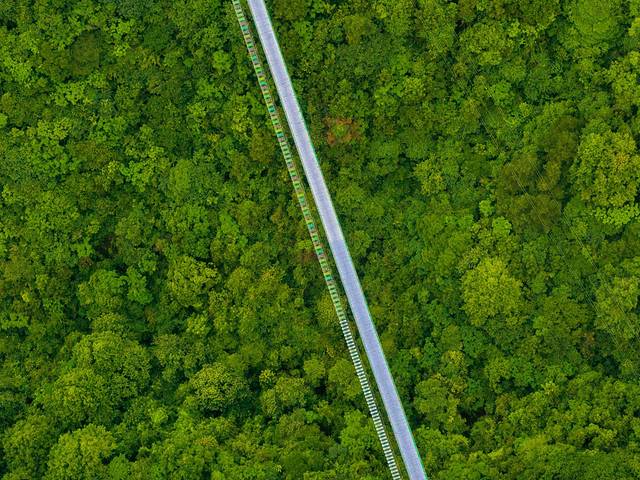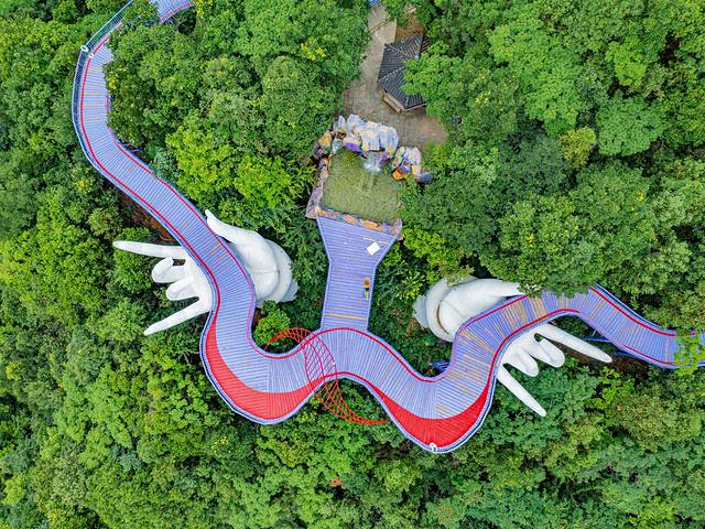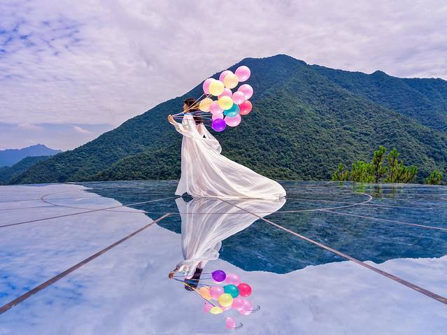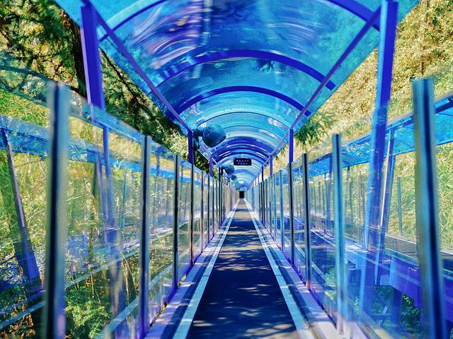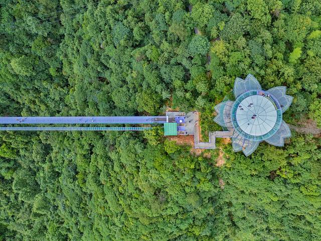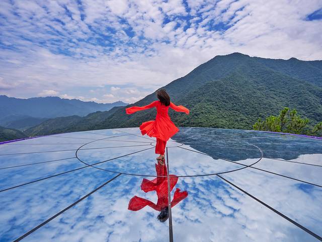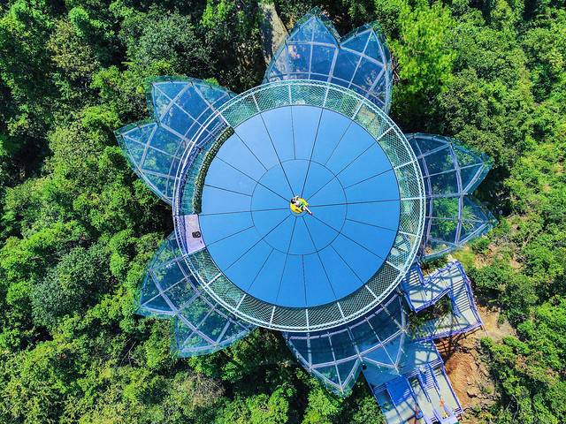 仿若一朵巨大的紫金花开在绿色深渊之中,足足有600多平方米,怪不得是“世界上面积最大的双层玻璃眺台”!这朵“紫金花”总共三层,二层是悬崖眺台,三层是天空之镜,通体晶莹剔透。蓝天白云之下的天空之镜真的超级出片!