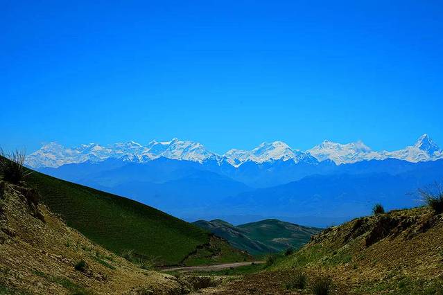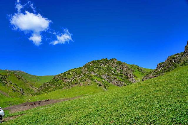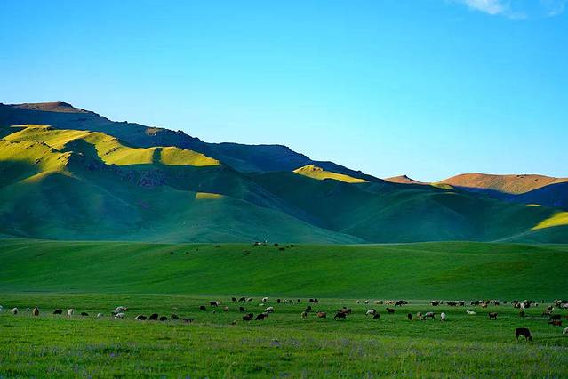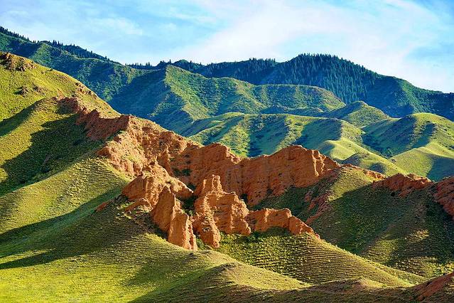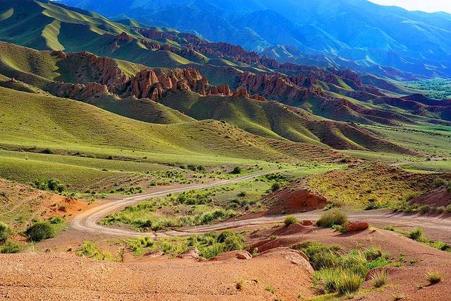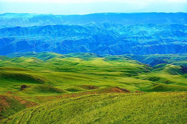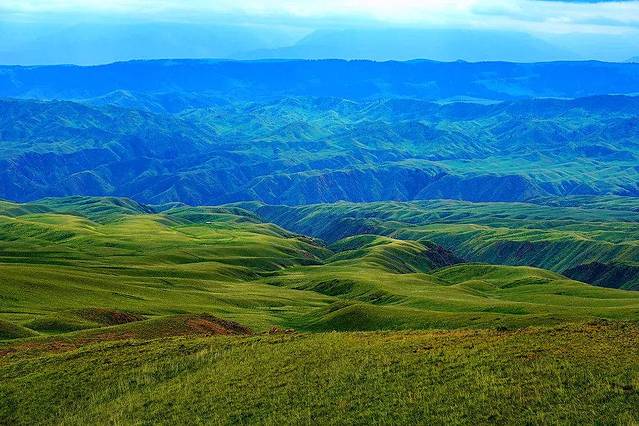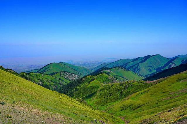 Ketmen呈高山深谷地貌,绵延的山丘此起彼伏,就像大地之上绿色的波浪线,弯弯曲曲。