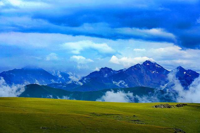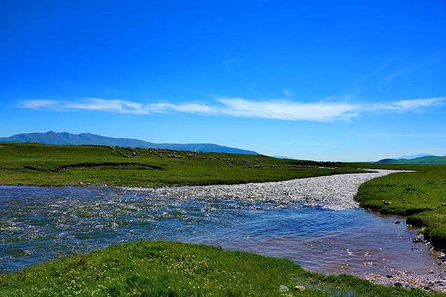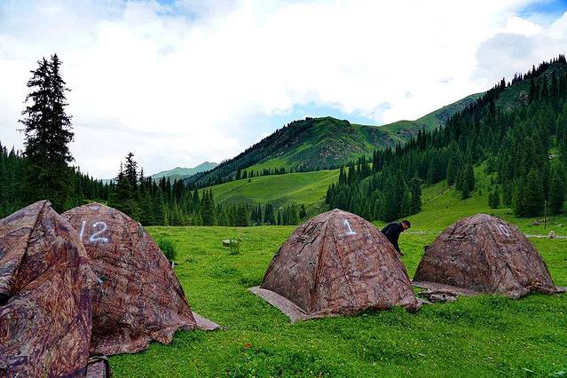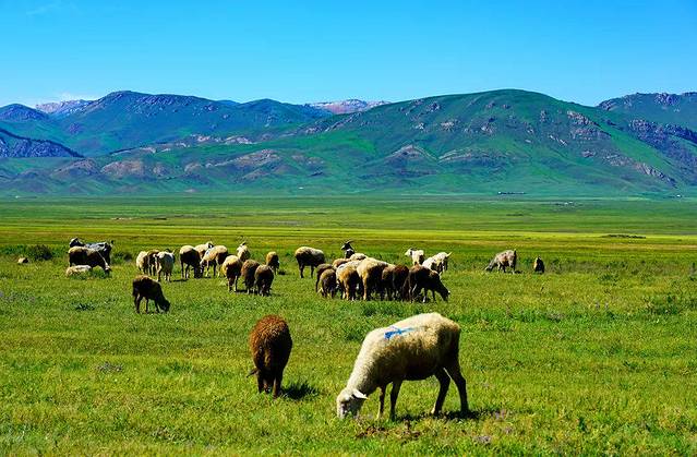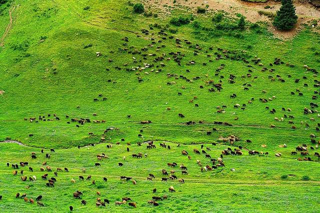 Assy高原海拔2800-3000米,在这里,雪山和草原紧密相连,白色的羊群在犹如绿色地毯的草地上慢慢蠕动,白色的 蒙古 包点缀其中,一切生命都似乎融入了这一片神圣而辽阔的土地。科学家们还在这里发现了5000年前古代人类的遗体,然而5000年过去,这里仍然保存着原始世界的自然和纯粹。