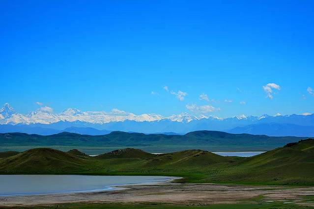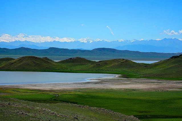 夏天热情的阳光播撒在这片土地上,映衬着蓝色的湖水、橙色的沙滩、碧绿的草地,以及远方那薄雾环绕的雪山。