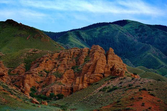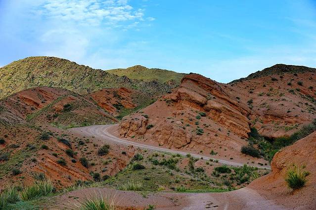 Bayankol峡谷距离阿拉木图市区大约380公里。一路在 哈萨克斯坦 野外平坦的公路上飞驰。远处巍峨的雪山一路相伴。它们沐浴着明媚的阳光,通体灿烁如银剑指天。那白色冠顶的山峰,似流银的白岩,在下方秀木葱郁的衬托下格外皎洁,让人心如明镜,神清气爽。
