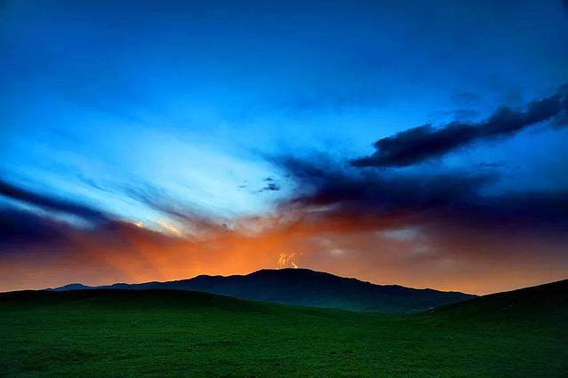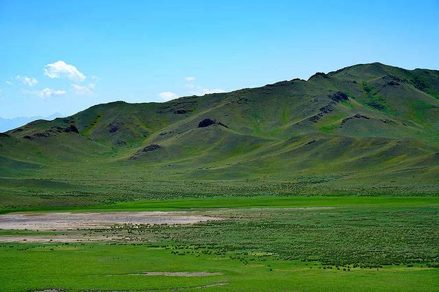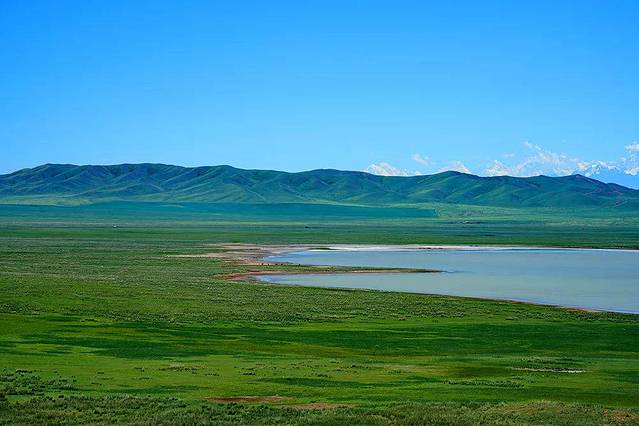 湛蓝色的天空点缀着朵朵白云,翠绿色的山丘与白云相接,映衬出生机勃勃的模样。群山包围着的是寂静辽阔的草原,而在这中间是一湾平静的湖泊。湖面安静地像一面镜子,倒映出绿色的影子,像山的颜色,也像草地的颜色。蓝色、白色、绿色、黄色......就像打翻了大自然的调色板,各种颜色混合在一起,构成了一幅自然画卷。
