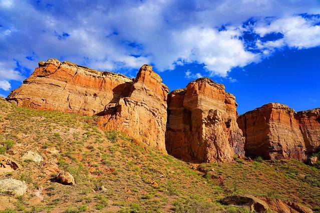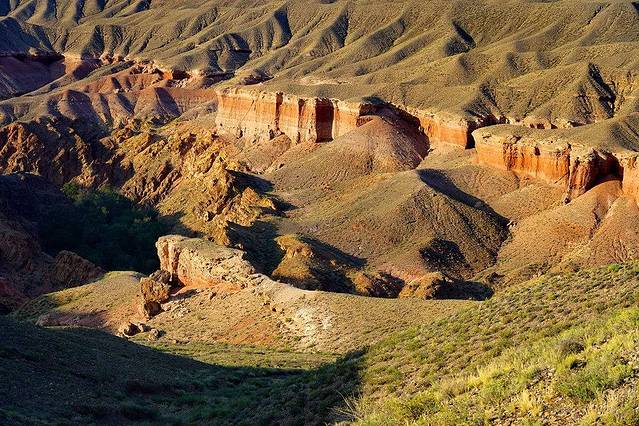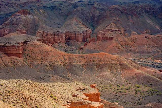 近处,映入眼帘的是一处由风和水联合创造的大自然的奇迹——这里是Temirlik峡谷。Temirlik峡谷像是上苍在草原腹地上撕开的一道狭长的裂缝,峡谷两旁是红色岩石形成的峭壁,留下风霜雨雪长年累月的侵蚀的痕迹。