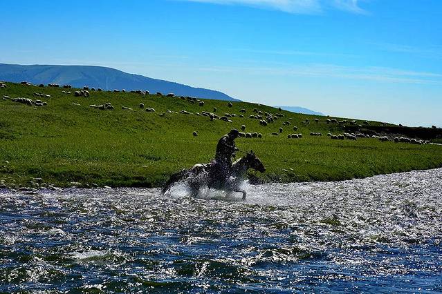 蜿蜒的河流穿过一望无际的草原,把大地的绿色地毯一分为二。不远处,羊群们吃过这里肥沃的食物,那健壮的身姿映衬在蓝天、雪山和绿草之间,点缀着一幅自然的山水画卷。在太阳下,那点点水泡似的 蒙古 包,闪烁着白光。