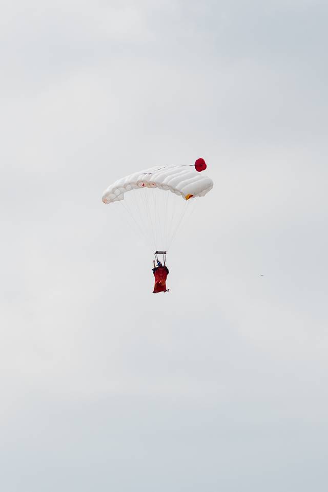 戴着冀装飞行人员的直升机升上天空,人们争相望向空中,看冀装飞行的人缓缓而降,安全降入会场内,引起尖叫自豪声一片。