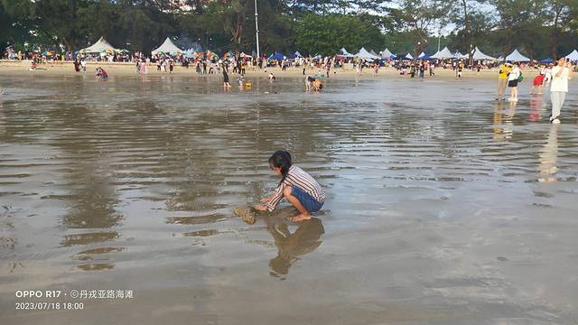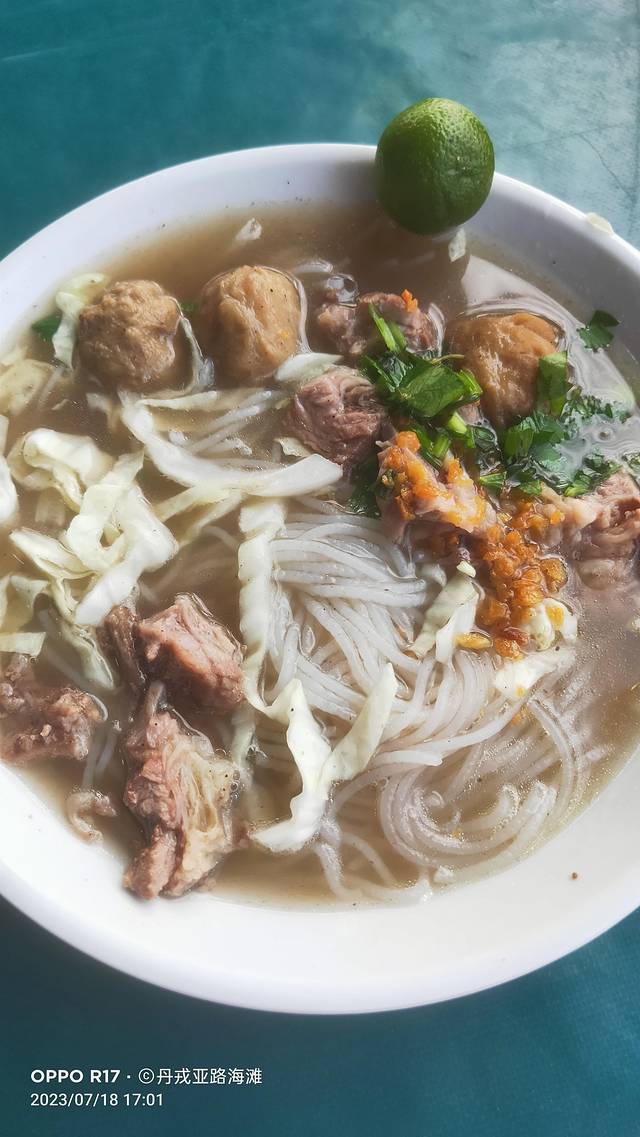 丹戎路海滩入口,是一个食品区,各式各样的美食展现在眼前,有烧烤,快餐,汉堡,炸鸡,果汁,面条等等,多不胜数。最后走到海滩的前面,在清真摊位上,吃了碗牛肉粉。是真的不错,汤浓,味美,肉香,小桔子挤点在汤里,开胃。好评!