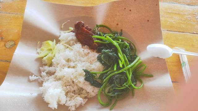 我拿了些青菜与鸡肉。又看看青芒,我想尝试一下芒果配饭是种什么体验,跟老板说了,他示意我淘一点点就好。所以我淘了一点青芒。味道配起来还是可以的,青芒比较青,很脆,汁多,酸。又点了杯橙汁,说是生意太好没了。便来了杯芒果汁,味道上比不上前一晚,因为前一晚的是真材实料。