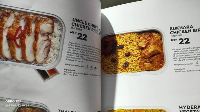 机上餐饮要买,饭是冻后入微波炉解冻的,要等20分钟,口味上相当差,不如吃个方便面6元马币,或是三明治。