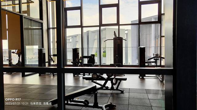 健身房对面是喝茶聊天的吧台,天空非常蓝,云朵非常白