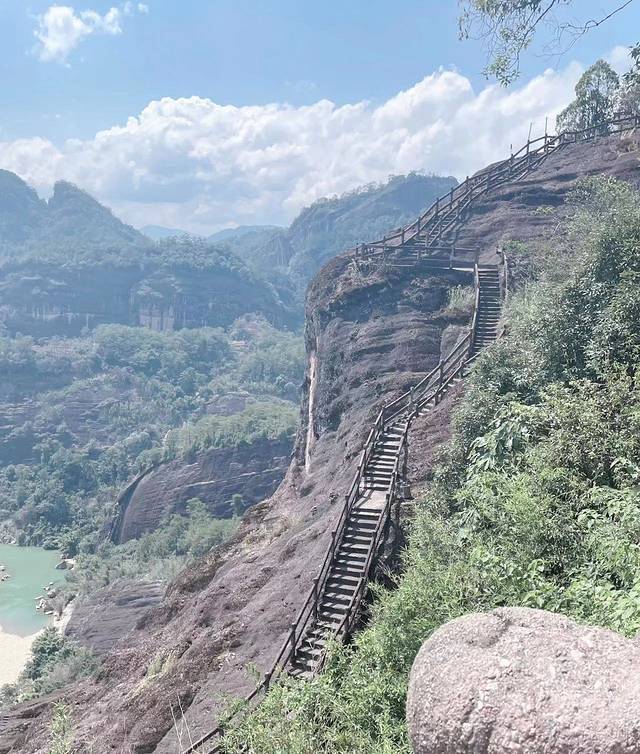 ✅【天游峰】早上从酒店🏨乘坐包车前往武夷山⛰️,大约一个小时左右的行程。个人感觉若要挑选一个能把武夷山的山水和自然文化结合起来的景点,那一定是天游峰了。整座山海拔高400米左右,爬起来其实不会很累,但由于是丹霞地貌,部分路段比较险峻,对于恐高的朋友来说算是个不小的挑战😂刚上山的话是一段林荫路还是比较凉快的,后半段上山的部分几乎没有遮荫的地方,一定得做好防晒再来爬山~山上的观景台可以看到山下的九曲溪,高山绿水的景色特别适合拍照打卡~到了山顶会有一个彭祖庙以及一些小商铺,之后下山是走另一条路,比上山的时候轻松很多~