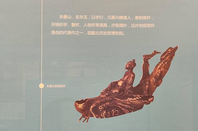 这件银制槎杯,制于元代,由 嘉兴 著名的银工朱碧山所制,存世四件,两件存于大陆,一件在 台湾 ,还有一件流失海外,门口的雕塑则是根据藏于故宫博物馆的那件,原样放大而成。馆内展览中图片所绘为 苏州 东吴博物馆所藏的造型,也就是说,四件的造型应该都有差异。