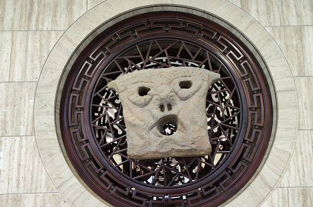 在博物馆的大厅中,又看到了一件奇怪的东西,它看起来是一件石制的物品,被镶嵌在屏风中,成了精美的装饰。这件物品的造型着实搞笑,像是某种动物的面部形象,表情极为夸张,张大着嘴,瞪着眼睛,甚至连鼻孔都张开了,似乎受到了某种惊吓。这样一件奇怪的物品,被置于正厅,肯定有其特殊的意义。