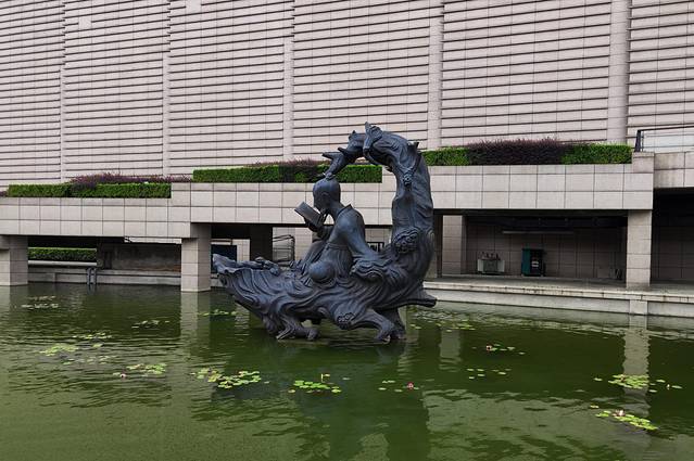 博物馆正门旁边的喷水池中,立有一尊造型别致的雕塑,一位手不释卷的老夫子,眼睛几乎快贴到书本上了,正聚精会神地阅读。他盘坐在一处像鱼又像龙的船形物体上,一只手支撑以保持平衡,非常可爱。这到底是个什么雕塑呢?它和 嘉兴 这座城市又有什么关联?为何要放在如此醒目的位置?带着这些疑问,走进了博物馆。