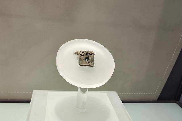 那件镶嵌于屏风上的物品,在马家浜文化展中找到了答案。马家浜文化,是目前 嘉兴 发现的历史最早的文化遗存,时间大约在6000-7000年之间,那时的人类还生活在新石器时代晚期,已经学会了制作陶器。这件物品的名称叫兽面形陶器耳,也就是陶罐上的一个把手,实物非常小。它虽为兽面却有人的表情,是人格化的动物形象,属十分罕见的史前陶塑珍品,虽为把手却造的那么有趣,这反应了远古人类对于生活的热爱。