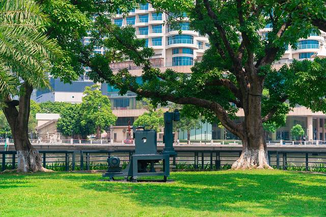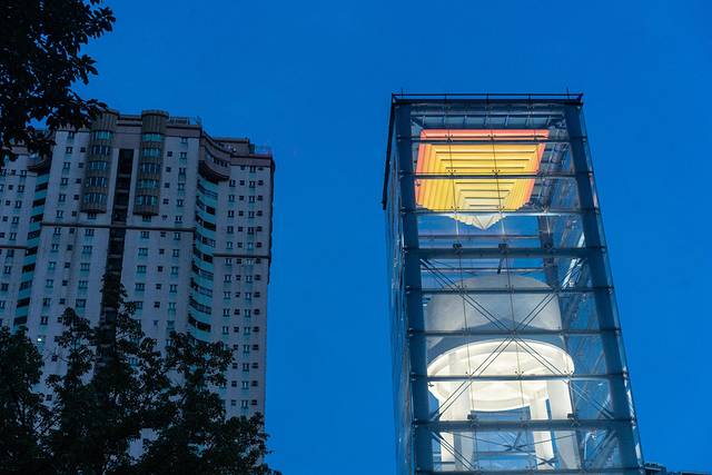 中山美术馆建在岐江公园内部,一般普通车辆是不被允许直接开入内的。平日里本地人最喜在傍晚的时候在公园内消食,那会艺术装置也打上灯光显得格外浪漫。