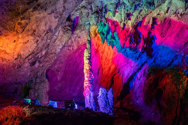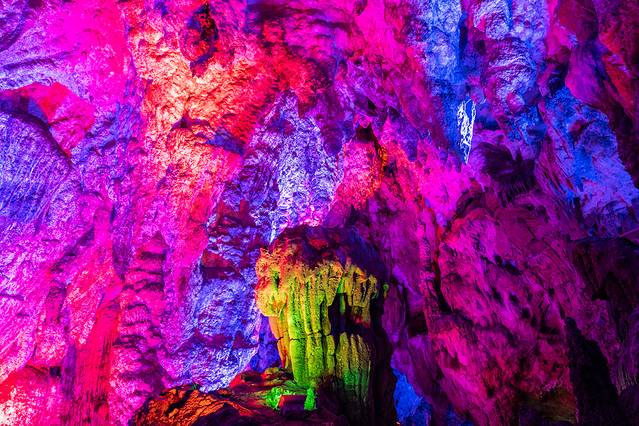 洞里有数不胜数的钟乳石奇观,每根钟乳石都有彩灯照射,五彩斑斓美丽极了。钟乳石千姿百态,有的像一根倒挂的笋,有的像用钟乳石林构成的瀑布,有的像定海神针,一根石柱拔地而起支撑着洞内的天地,好像如果没有它山洞就会塌下来一样。