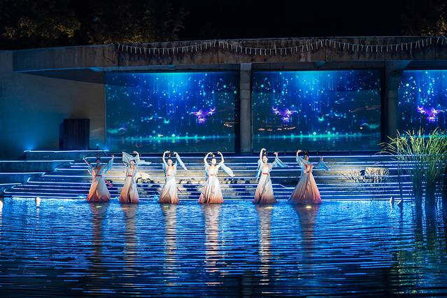 夜幕下的宽心小镇,除了《亮塔仪式》,还有《云水禅心》水幕光影秀、《禅行》巡游祈福荷花灯、《听溪坐忘》行为艺术、《悟·宽心》古风主题舞蹈等特色表演,吸引游客里三层外三层的围观。