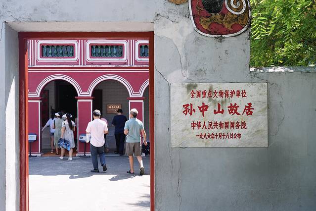 这个景区无需门票,只需要实名制预约并安检就可以入内。一走进来,右手边一栋极为鲜艳的红色建筑,便是孙中山故居。这并非是祖屋,而是孙中山长兄孙眉于1892年从檀香山汇款回来由孙中山设计和主持修建而成的一幢砖木结构三开间两层楼房。
