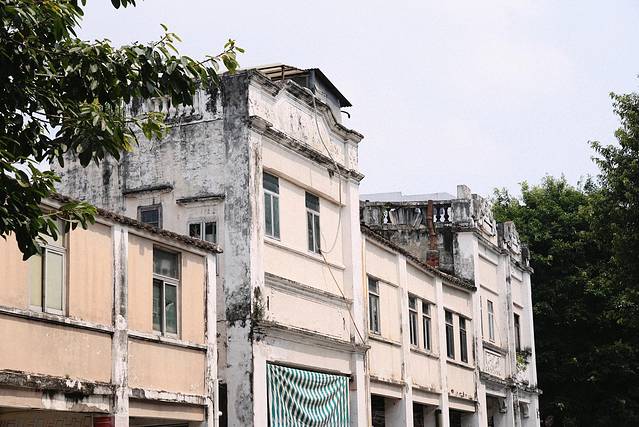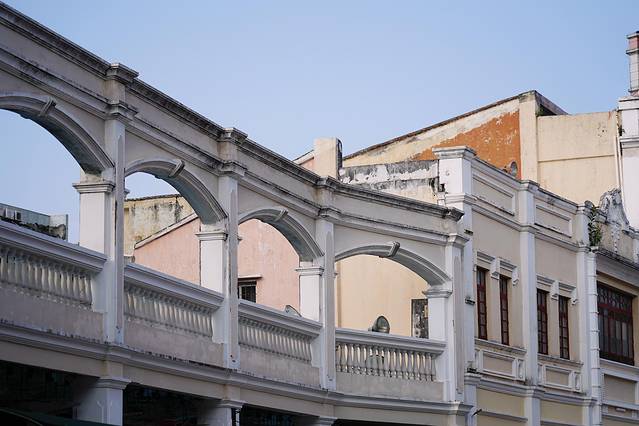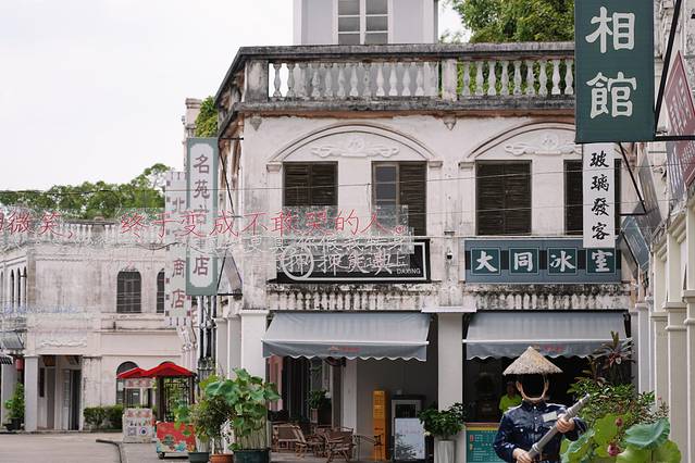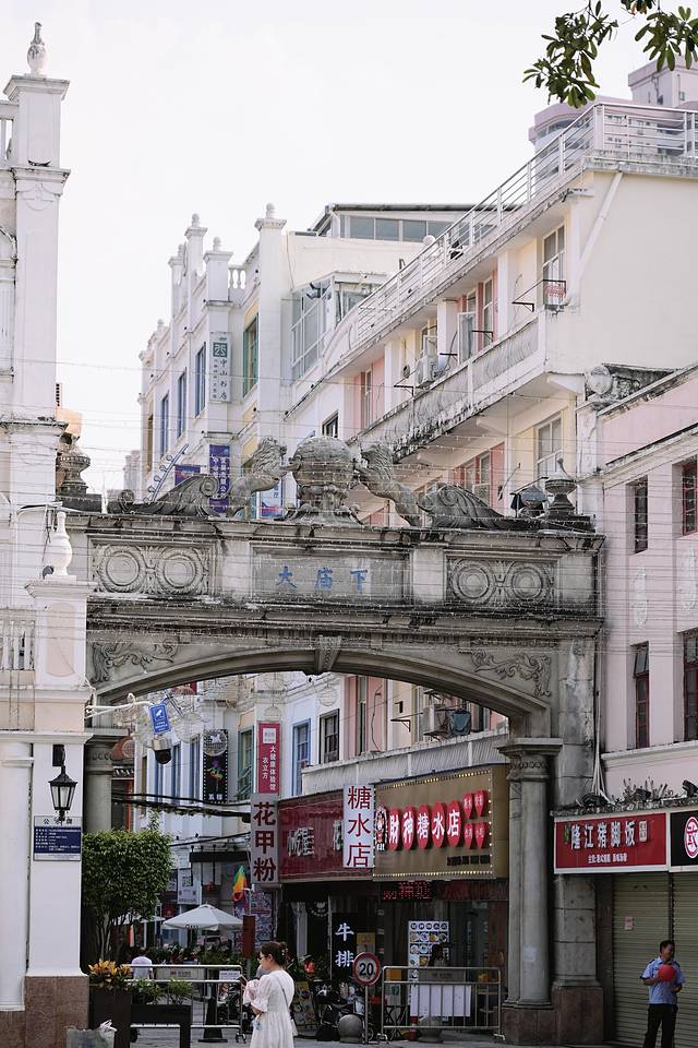 这些骑楼风格整齐划一,颜色多为淡雅素净,木雕、灰塑等建筑艺术保留的非常完好,加以植物的点缀,让颇经岁月洗礼的老建筑焕发着一种生机和活力。所有的骑楼建筑一楼,如今都已规划成为了店铺,售卖食品、服饰以及各类旅游纪念品,时不时传来的声响与这条历史上著名的商街有了时光的呼应。甚至不需要做什么攻略,沿着这条街的一头走到另一头,就会有许多建筑、雕塑让我不自觉地停下脚步,频繁地按下手中的快门。
