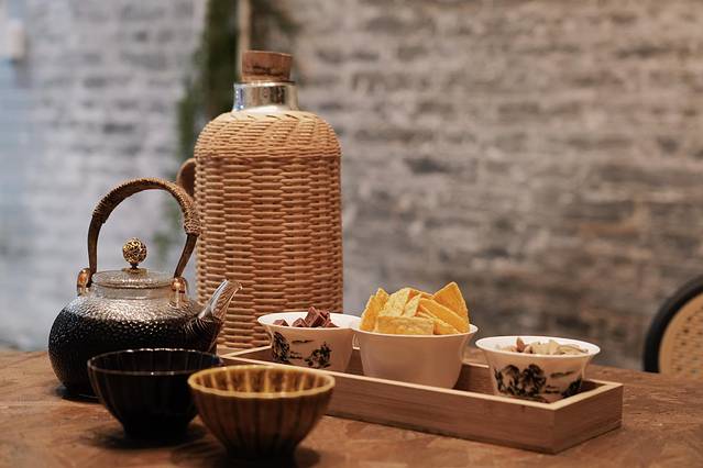 来的时候已经到了傍晚,下午饮茶的客人早已离去,这座老宅恢复了往日的宁静。石制砖墙、精美木雕、原木桌椅,还有许多颇有禅意的小装饰,让这座茶室古色古香的同时,又充满了静谧和优雅。