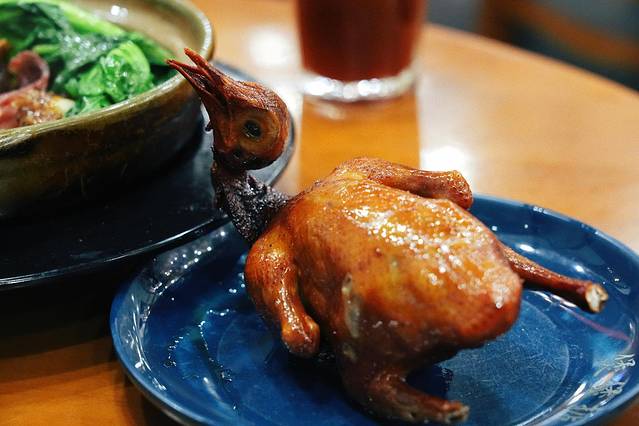 中山最著名的美食,当属石岐乳鸽。石岐乳鸽的品种肉质软嫩多汁,味道鲜美,是钟爱“鲜”味的老广人首选的乳鸽品种。当地人烹饪乳鸽又独特的门道:洗干净的乳鸽飞水,在放入白卤水中浸至八成熟,上脆皮糖浆后晾干,最后放入约120度的热油中炸制 光泽 的大红色。