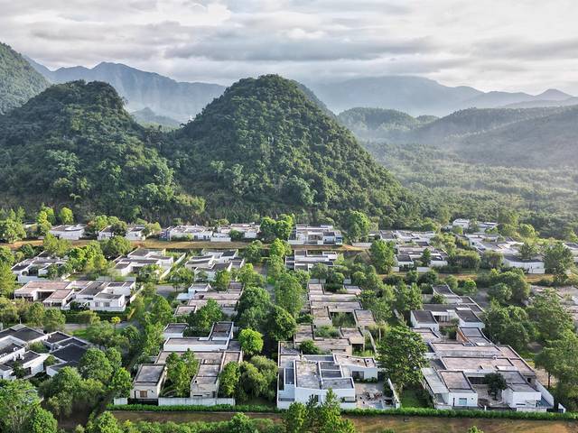 这是一个竹林、茶山、绿田、溪水环绕的山水田园
