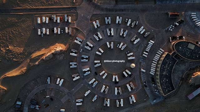 航拍整个舞台,舞台后面就是层层叠叠的沙漠,观众跟着剧情发展,需要转动5个方位。