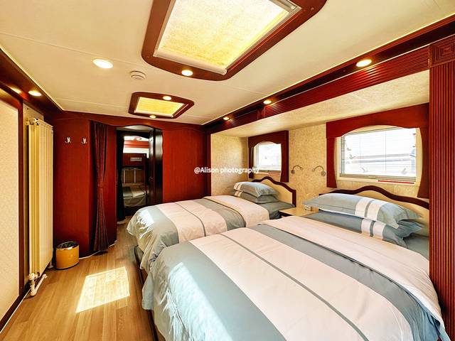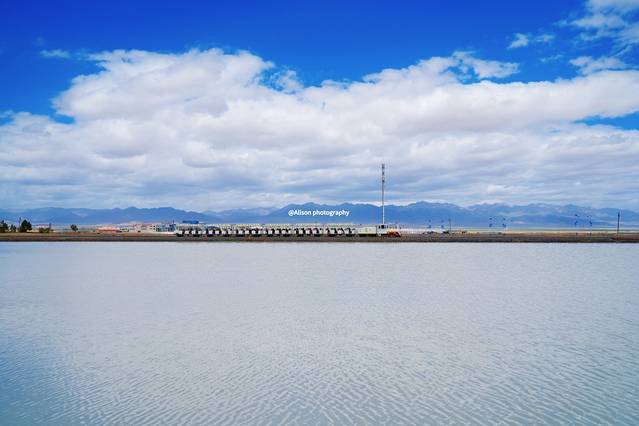 茶卡盐湖最经典的就是乘坐小火车穿越湖面。火车头轰隆隆拉着6节车厢一路开向远方,车速并不快,人坐在车厢里,感受微风扑面。远处的高山连绵成了线,像极了漫画里的场景。在这里,远离世间纷争,身心同归于静。