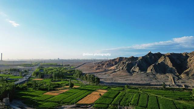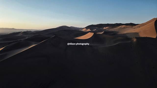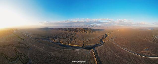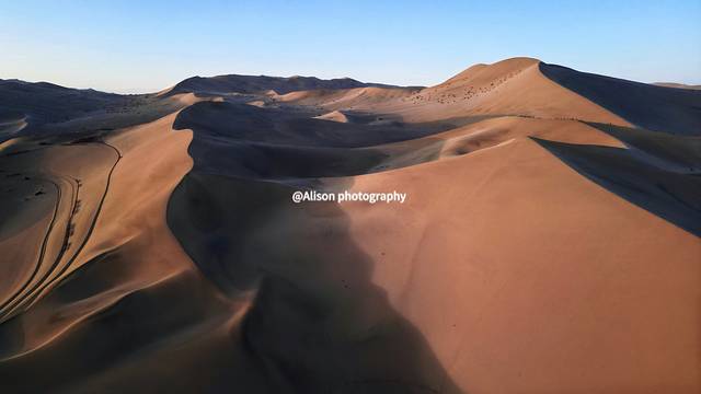 清晨日出东方,光芒洒在山中泛起一片金黄色。风吹沙飘越过山丘,漫漫黄沙直通蓝天。