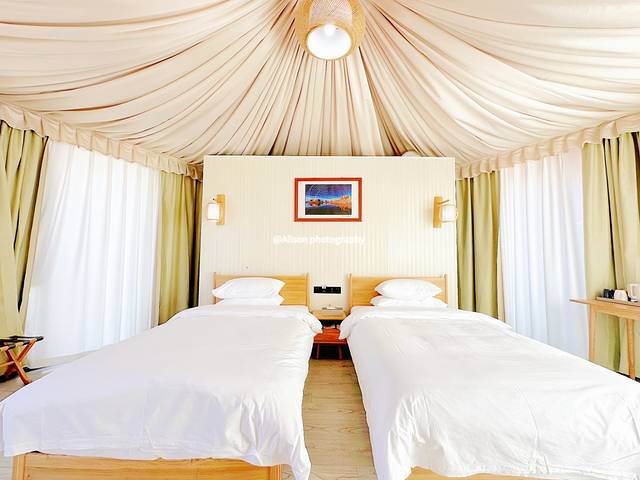野奢帐篷的配置在西北来说我觉得算不错的了,双床房布置干净敞亮没有气味。这边气候干燥,每天房间放的矿泉水也比一般酒店要多。