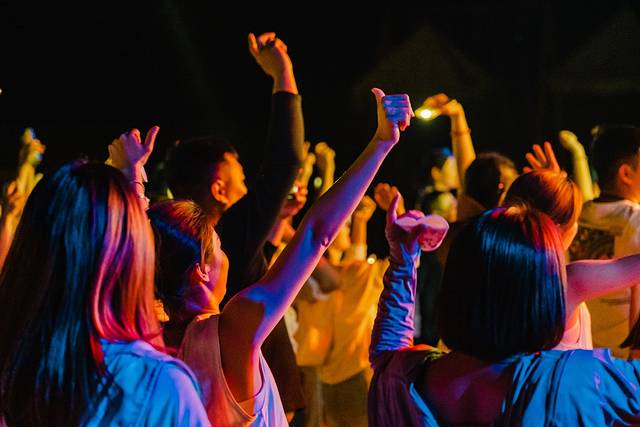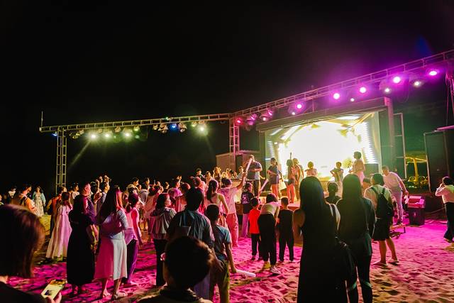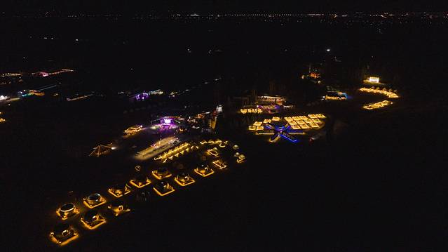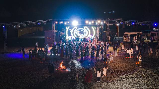 夕阳缓缓道出沧桑,夜幕降临带来霞光,鸣沙山环抱着的大漠传奇沙漠露营地开始了夜里的狂欢。篝火点亮沙漠夜空也唤醒了点点繁星。