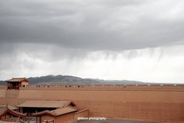 在关城景区的时候,看着天空的云层逐渐变厚,天色一下暗淡下来,我明白一场暴风雨即将来袭。果然瞬间大雨倾盆,站在城楼上看着眼前的狂风大雨,更觉得坚不可摧。