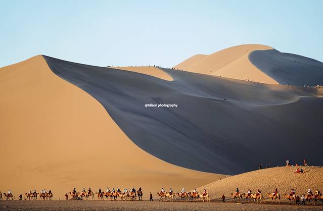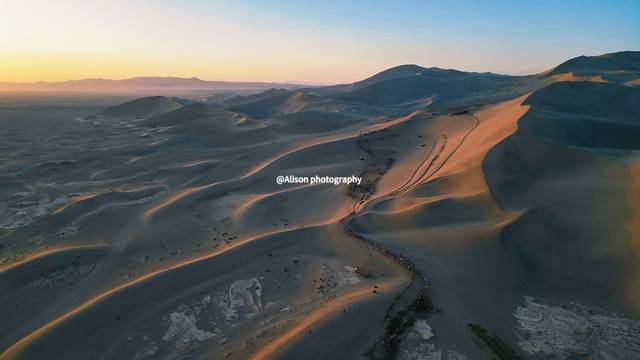 鸣沙山月牙泉景区骆驼数量上千头,不想排长队一定要起得够早,清晨6点我在景区飞无人机拍下的照片,骆驼大军几乎可以连线
