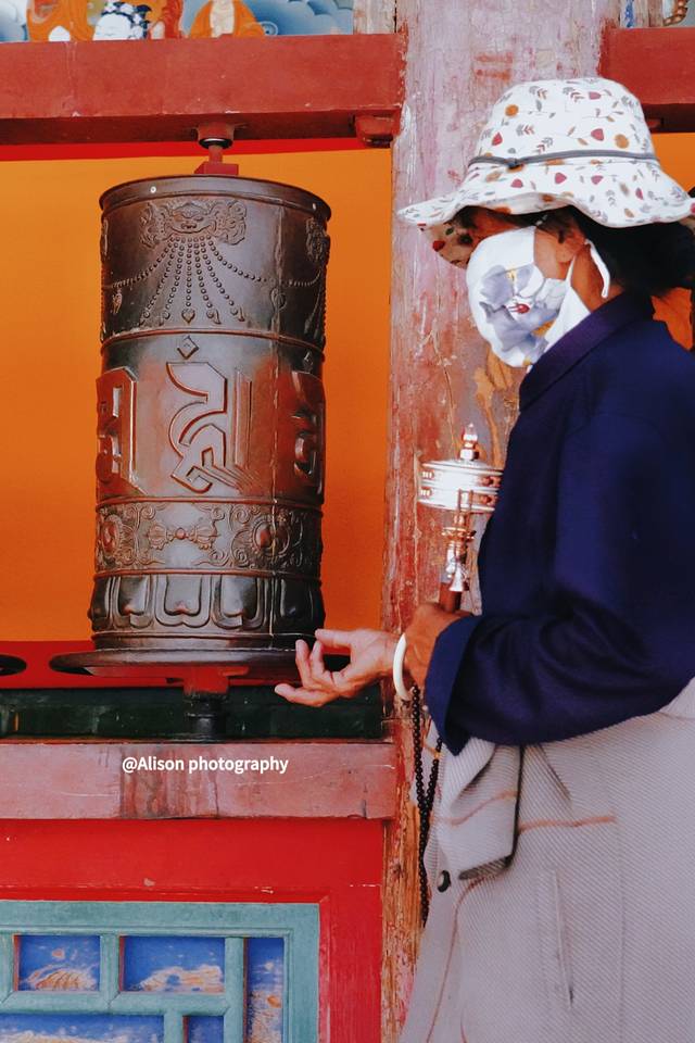 在寺里的转经筒前,大家都有序地顺时针转动着,心中默念着...