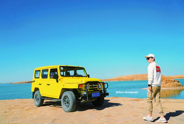乘坐黄色的越野车深入到水上雅丹景区之中