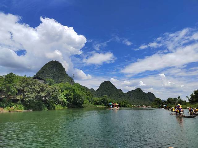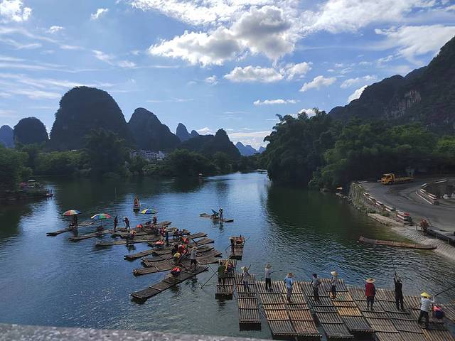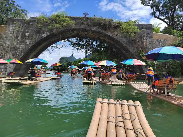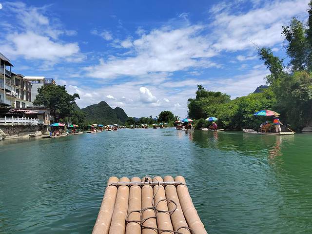 在阳朔的第二天,竹筏是在前一天晚上抢的票(暑假太热门了,需要在网站上抢票,我们手速不够快,抢不到前面热门码头的票,只好抢最后一段遇龙桥休闲游)。我们先是吃了一顿桂林米粉(好吃ლ(´ڡ`ლ))再然后还是小电驴去十里画廊,码头在十里画廊的沿路。沿路风景真的都很美,非常适合骑行。(但是要注意防晒,进入大门口的时候就有一些蝴蝶泉等景点,我们也没去看,直奔里面)。遇龙桥码头是在最后一段,骑了大概得有十几公里吧才到达,这段码头的人也是最少的,登上竹筏,我们就开始一段最悠闲的漂流。这段漂流只有一个冲坝,时间也很短,说是50分钟,但是实际来回也才30多分钟,不过两岸风景真的绝美。