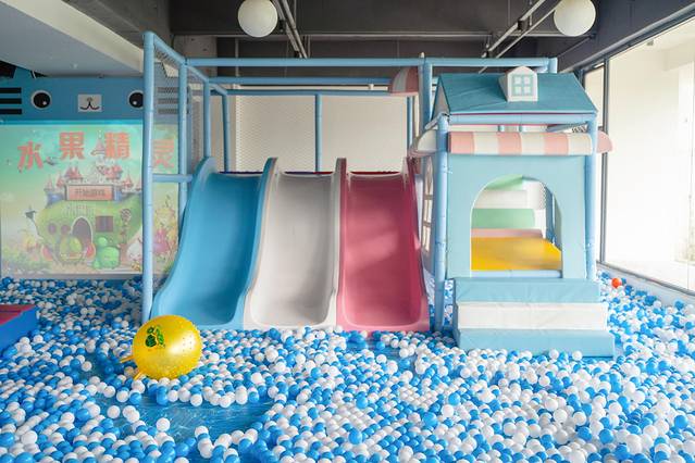 水上滑梯、攀爬架等,还有童趣可爱的水果玩偶造型,小米粒在这里玩的不想走。