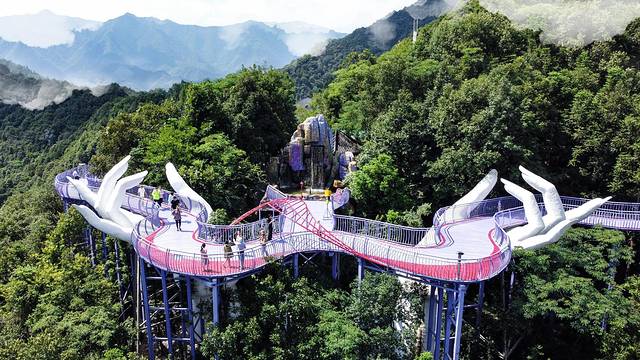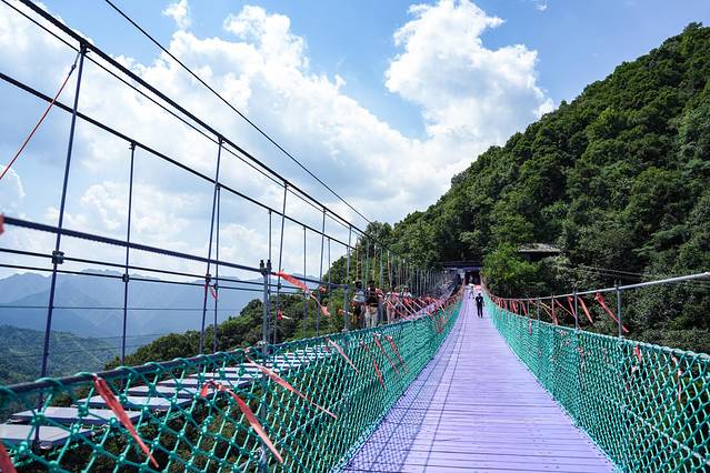 这是横跨在两座山峰之间的天桥!全长300米,喜欢刺激的可以选择步步惊心,脚下即是万丈深渊,胆子小的可以选择走云梯天桥。