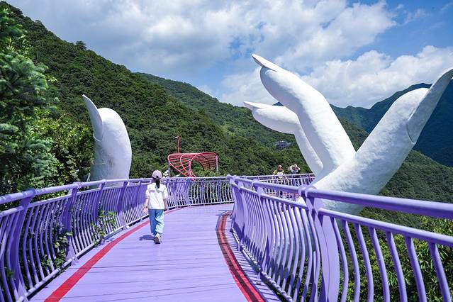 山谷中象征着爱情的两只白色的纤纤玉手,托住一条紫色长道!不管近看还是航拍都是很震撼!中间还有个呐喊喷泉,嗓门大的可以一试,能喷的非常高!