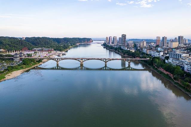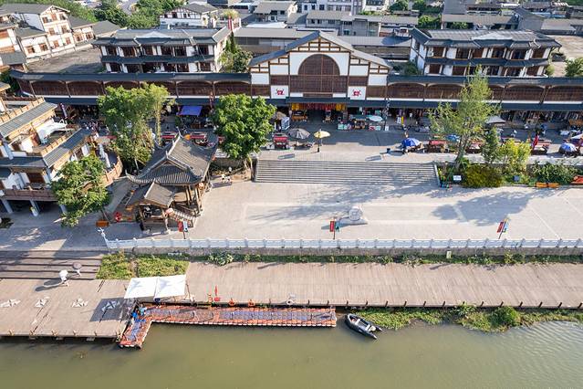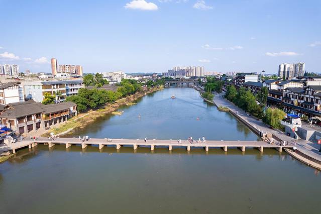 苏稽古镇是“跷脚牛肉第一镇”,也是拥有1400多年悠久历史的古镇。一条清澈的峨眉河,穿镇而过,两岸布满了白墙黑瓦、木雕砖刻的明清建筑。峨眉河上还有一座古桥,来来往往穿行的游人仿佛像是在画中游。这里有鳞次栉比的各式商铺,有小桥流水人家,还有古朴的石板路和风雨连廊。沿着河流而下,还有一处鱼鳞坝。它是夏日宠儿,男女老少都爱的玩水胜地。在阵阵清凉和欢声笑语中,你可以尽情地湿身。