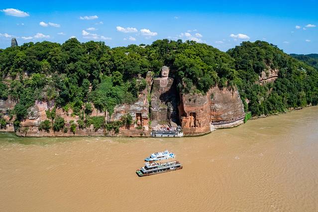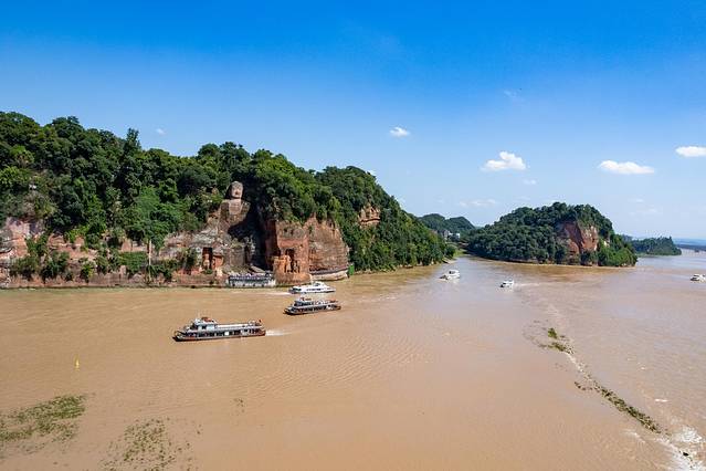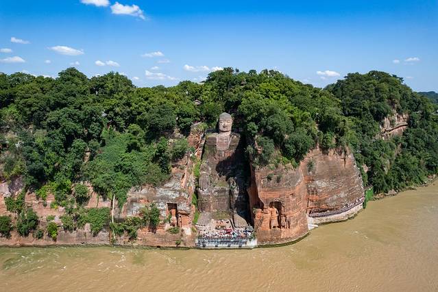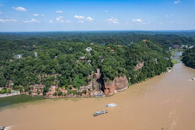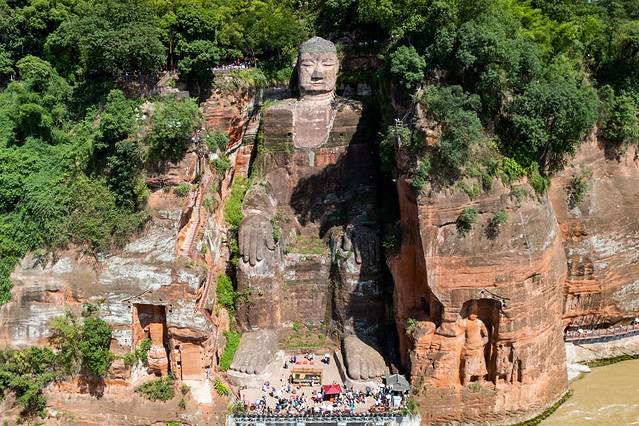 乐山市市中区的乐山大佛,闻名中外。小时候在书本、报纸、电视上都见过,武侠电视剧《风云》里的经典场景更是记忆深刻。乐山大佛,又名凌云大佛,为弥勒佛坐像,通高71米,是我国最大的一尊摩崖石刻造像。巍峨壮丽的大佛,就矗立在大渡河、青衣江和岷江三江汇合处。乐山大佛和凌云山、乌尤山、巨形卧佛等景点组成的乐山大佛景区,是国家5A级旅游景区,也是世界文化与自然双重遗产峨眉山-乐山大佛的组成部分。