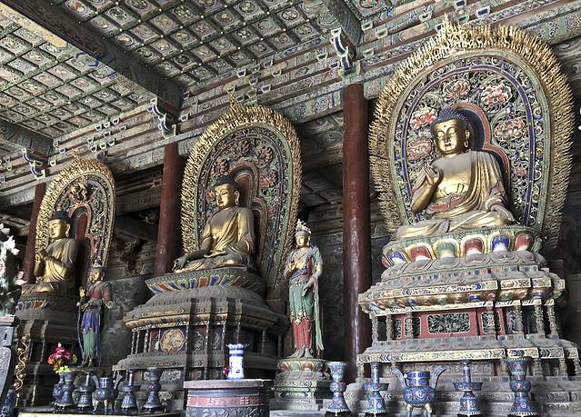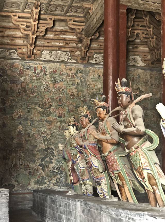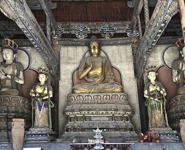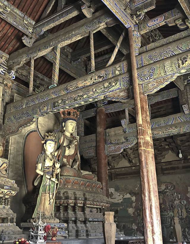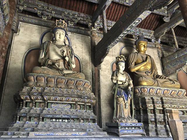 大雄宝殿是现存辽金时期最大的佛殿之一。那正脊上的琉璃鸱吻,规模很大,高达4.5米,由八块琉璃构件组成,北吻是金代的原物;南吻是明代制作,也是中国古建筑上最大的琉璃吻兽。欣赏了一下外观进入殿内。