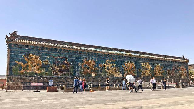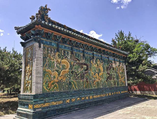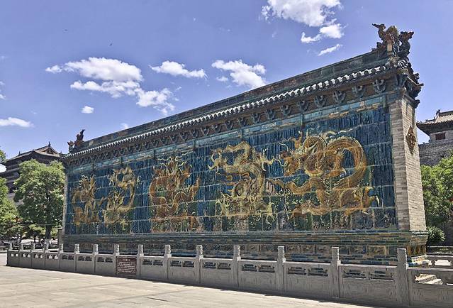 欣赏了大成殿,便去找五龙壁,上次不知道错过了。大同文庙五龙壁是大同现存诸龙壁中唯一的一座砖雕龙壁,从雕塑风格看,为清代遗物,壁身五条团龙的中央一条,巨大龙头正对着原县文庙的大门,团龙中心有一颗硕大的火珠。从中心向外数的第一对是腾空飞舞状的飞龙。第二对团龙的头向着中心,也作腾飞之状。四条巨龙都张口怒目,象是在吞云吐雾,气宇非凡。细细欣赏感觉还是不错的。