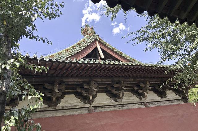 饭后直奔华严上寺。上台阶重又见到浑厚宏伟的大雄宝殿,看见屋脊上那硕大的抵吻,心情不由得愉悦起来,如见到老朋友一般,想拥抱亲近她。