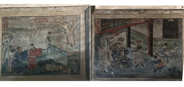 殿西侧的清代壁画是之前从另一处已毁的关帝庙揭移过来的,内容是《府库封金》《单刀赴会》之类的关公故事;东壁二龙戏珠壁画是民国所绘。