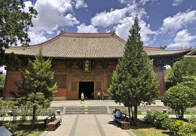 三圣殿位于寺内中部,建于高约1.5米的砖砌台基之上。殿面阔五间,进深四间,单檐庑殿顶。檐下斗六铺作,单抄双下昂,重计心造。殿内采用减柱法。三圣殿佛坛上的华严三圣为金代原塑,后人予以重装。殿内两侧有金碑2通,其中金大定十六年(1176年)《大金西京大普恩寺重修大殿记》是南宋使金通问副使朱弁所撰。