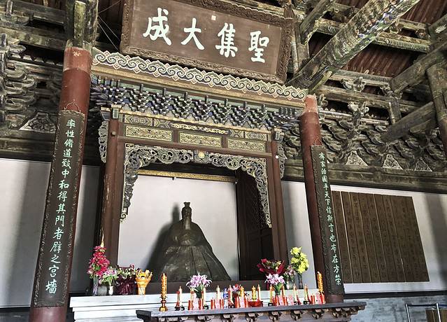 大成殿是文庙的主要建筑物,为明代所建。清顺治、乾隆时期多次进行修葺。整个建筑置于月台上,座北朝南,呈“凸”字形,面阔五间,进深三间,单檐歇山顶,斗拱六铺作,每间两朵。横拱正面下部均砍成斜面,为明、清常见做法。转角斗拱繁缛复杂,其结构意在承托翼角。柱网排列属减柱做法,增加了殿内前部的活动空间。
