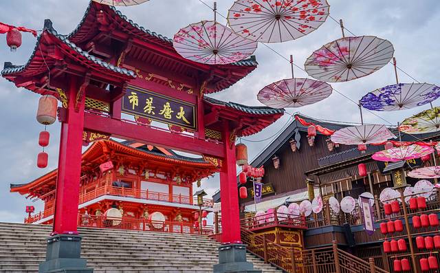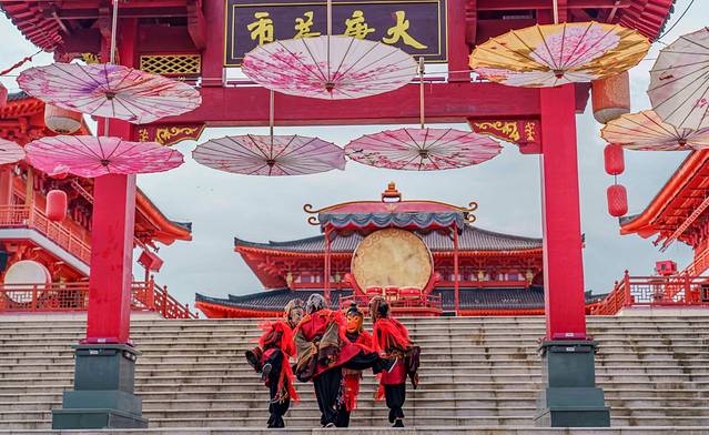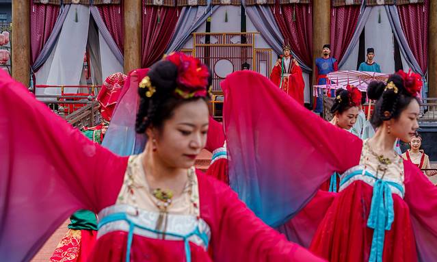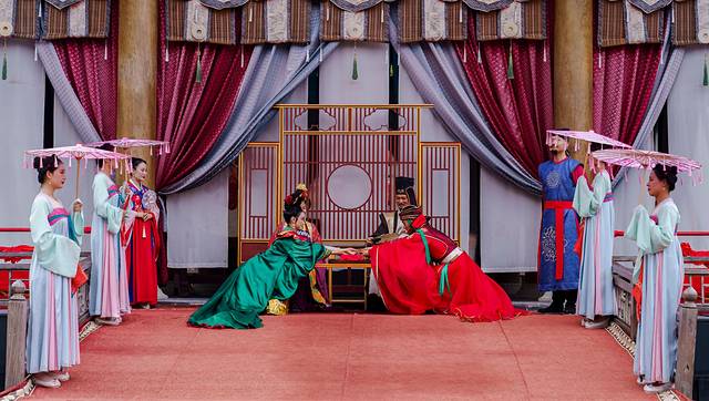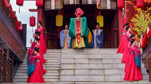大唐茶市是一处极具“唐风”的建筑群,利用航拍从空中俯视时才发现这片建筑为一个心型,难怪表演的节目也是爱情故事,作为中国首创的沉浸式唐风主题体验街区,在这里不仅可以拍到漂亮的古风美照,也有着有趣的浮梁盛事和精彩的节目表演,还可以体验地道的浮梁美食,为游客创造了无缝全沉浸式游览体验;这一次我看的中午场节目,演员全程会与观众互动,还有古诗词背诵环节,加上现场投壶、说书、围棋等各种古风项目都可以体验,参与感极强~