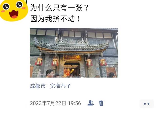 超出想象,宽窄巷里,人挤人是有些挤不动的那种。人群在缓慢的行动,天气又热,地表上的热气往上蒸,可想而知那个热度!